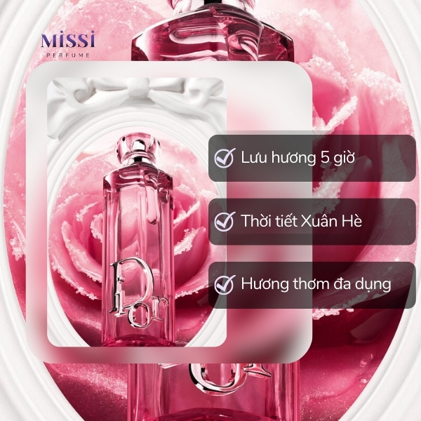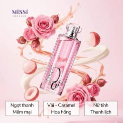 Dior Addict Rosy Glow là mùi hương nịnh mũi nhất trong bộ sưu tập Addict. Hương vải mọng nước mở đầu, tiếp nối là hoa hồng thanh thoát như nụ hôn vừa hé nở, kết thúc cùng caramel ngọt ngào. Trẻ trung, nữ tính và cực kỳ dễ dùng. Phù hợp cho ngày Xuân – Hè, từ đi làm đến hẹn hò.