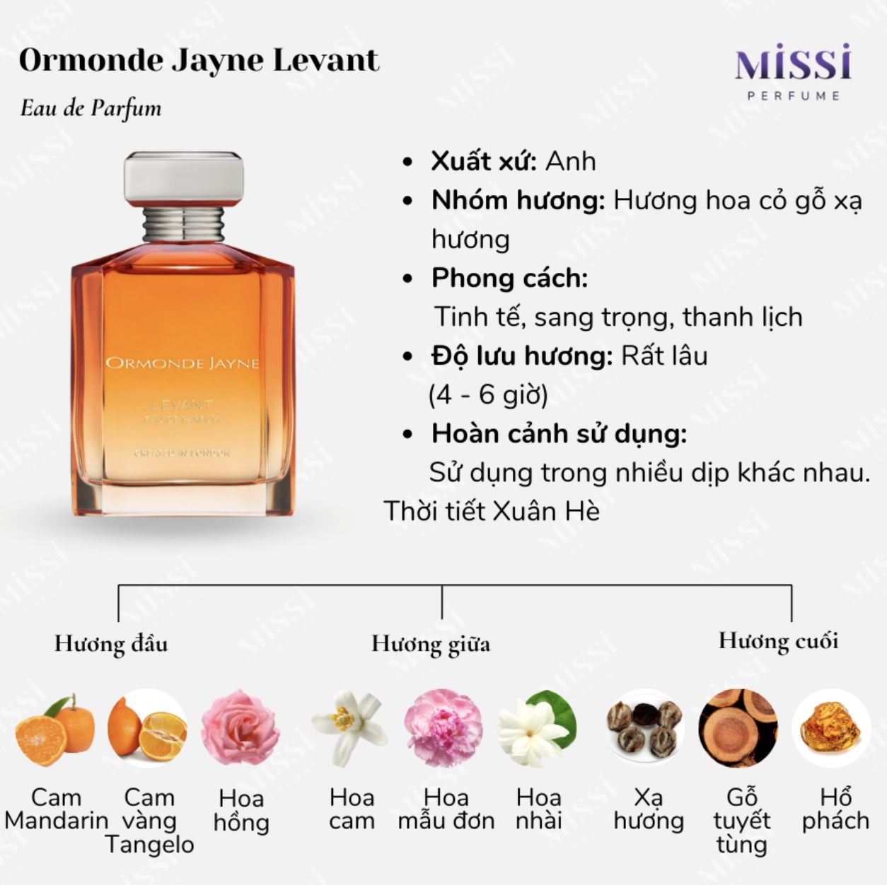 Ormonde Jayne Levant là dòng nước hoa nữ ra mắt năm 2020, mang tinh thần tươi mới và tích cực. Ngay từ những nốt hương đầu tiên, mùi hương đã tạo cảm giác sảng khoái và dễ chịu. Đồng thời, sự kết hợp giữa cam chanh và hoa giúp tổng thể trở nên nhẹ nhàng nhưng vẫn rất cuốn hút.